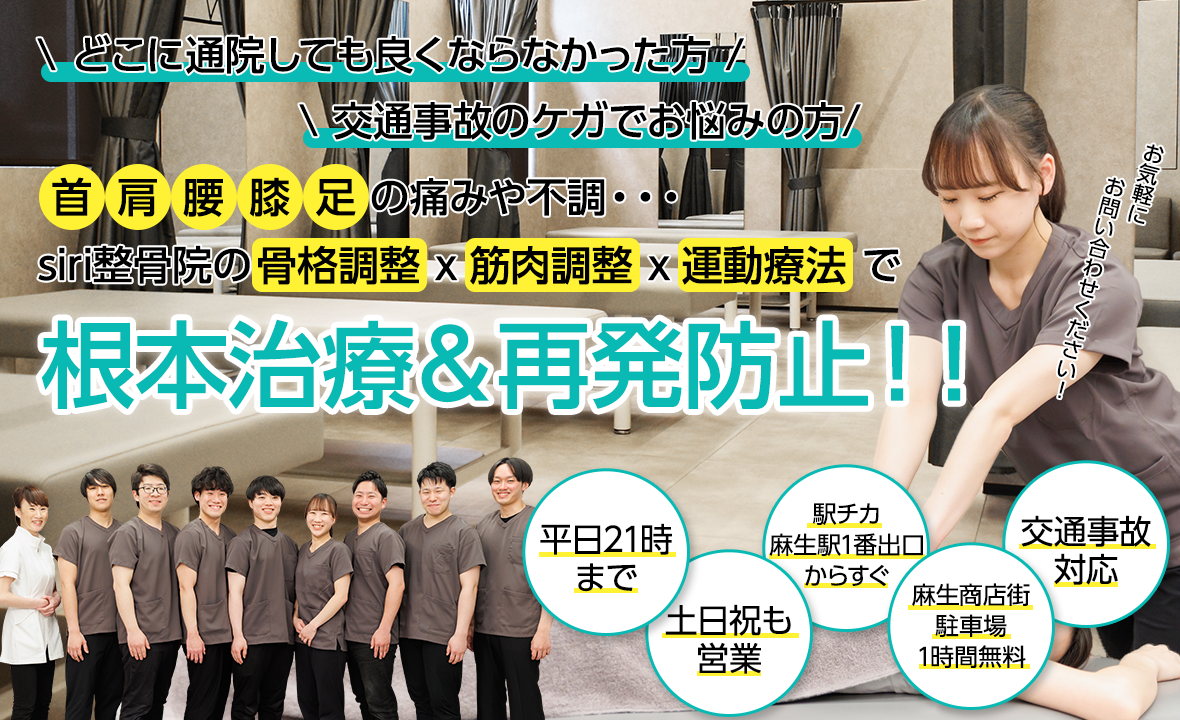 交通事故の知識と施術経験が豊富なスタッフが在籍しています。また、弁護士事務所・行政書士の先生と連携しており交通事故後の種々のお悩みについて対応しています。ご安心して、お気軽にご連絡ください。